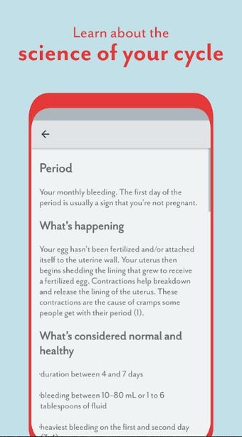 Pour renforcer l'efficacité de vos prédictions de fertilité, vous devez renseigner les détails de votre TBC, de votre fluide cervical et de votre test d'ovulation lorsque vous suivez votre ovulation et votre fertilité. Lors du suivi de votre grossesse, en revanche, vous devez saisir vos symptômes de grossesse et de post-partum ainsi que vérifier le développement du fœtus semaine après semaine à l'aide du contenu guidé. Son équipe scientifique interne présente également des articles éducatifs abordant des sujets liés à la santé menstruelle.